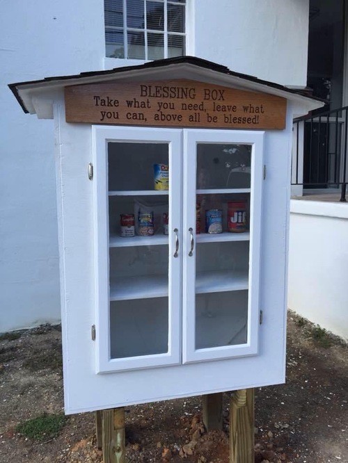 A blessing box is a ministry that serves the community by giving easy access to goods such as non-perishable food and hygiene products and functions on a “take what you need, leave what you can” system. The box is completely stocked by donations so that the community may be blessed by the generosity of others. Our box was established in July of 2017.