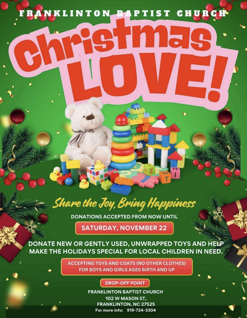 We are collecting new or gently used unwrapped toys through Saturday. November 22, 2025. They will be distributed to needy families in our community. We are also collecting coats also (no other clothes). Drop off: 102 West Mason Street, Franklinton, NC. 9AM - 2PM, M-F. Sunday: 9AM - 12PM. For more information please contact Phil DiFrancesco 919-724-3304.