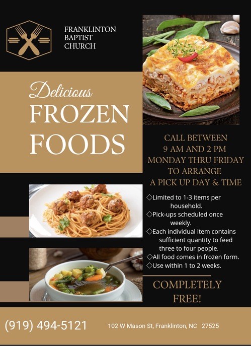 -A frozen food pickup and distribution from the church. Call in advance to pick up. 919-494-5121. See add on the left.